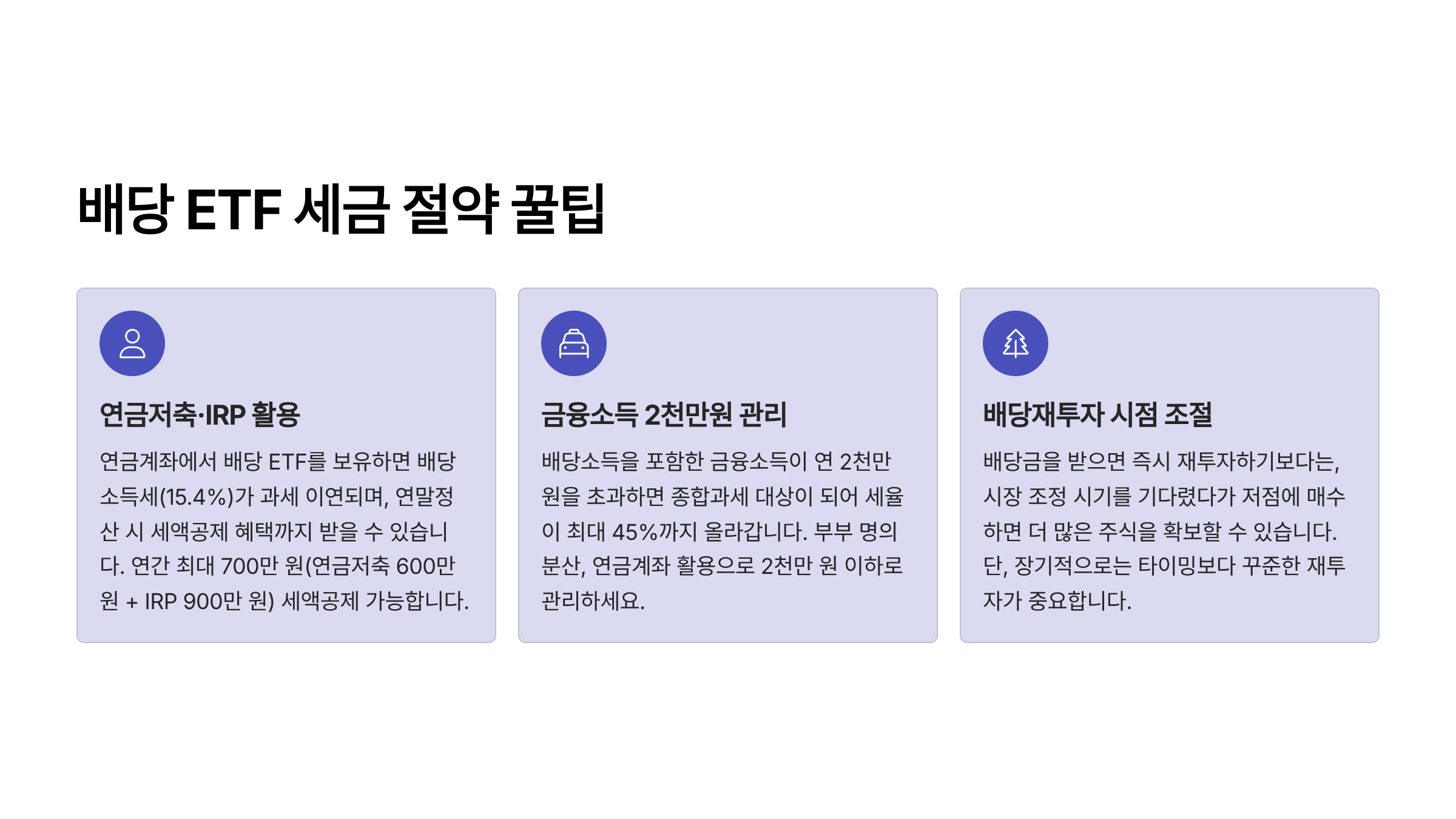 미국 ETF 배당금에는 현지 원천세 15%와 국내 배당소득세 15.4%가 부과돼요. 하지만 몇 가지 방법으로 세금 부담을 줄일 수 있어요.