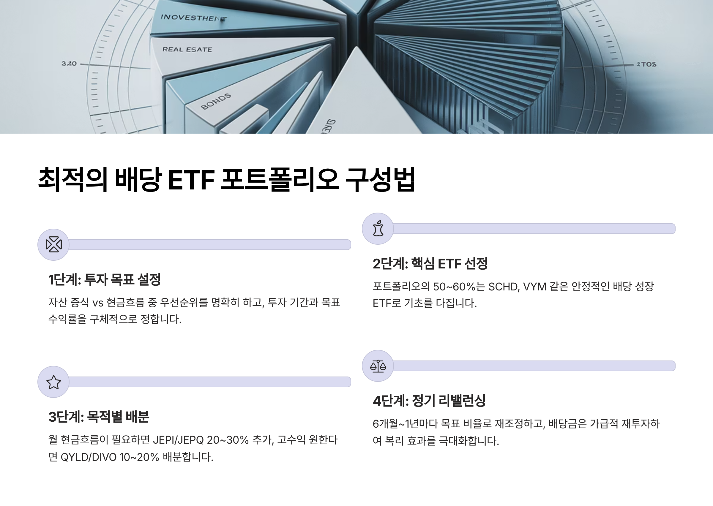 배당 ETF 포트폴리오는 투자 목적과 나이에 따라 다르게 구성해야 해요. 젊은 투자자라면 성장성이 있는 ETF 비중을 높이고, 은퇴가 가까운 분들은 안정적인 월 배당 ETF 비중을 늘리는 게 좋아요.